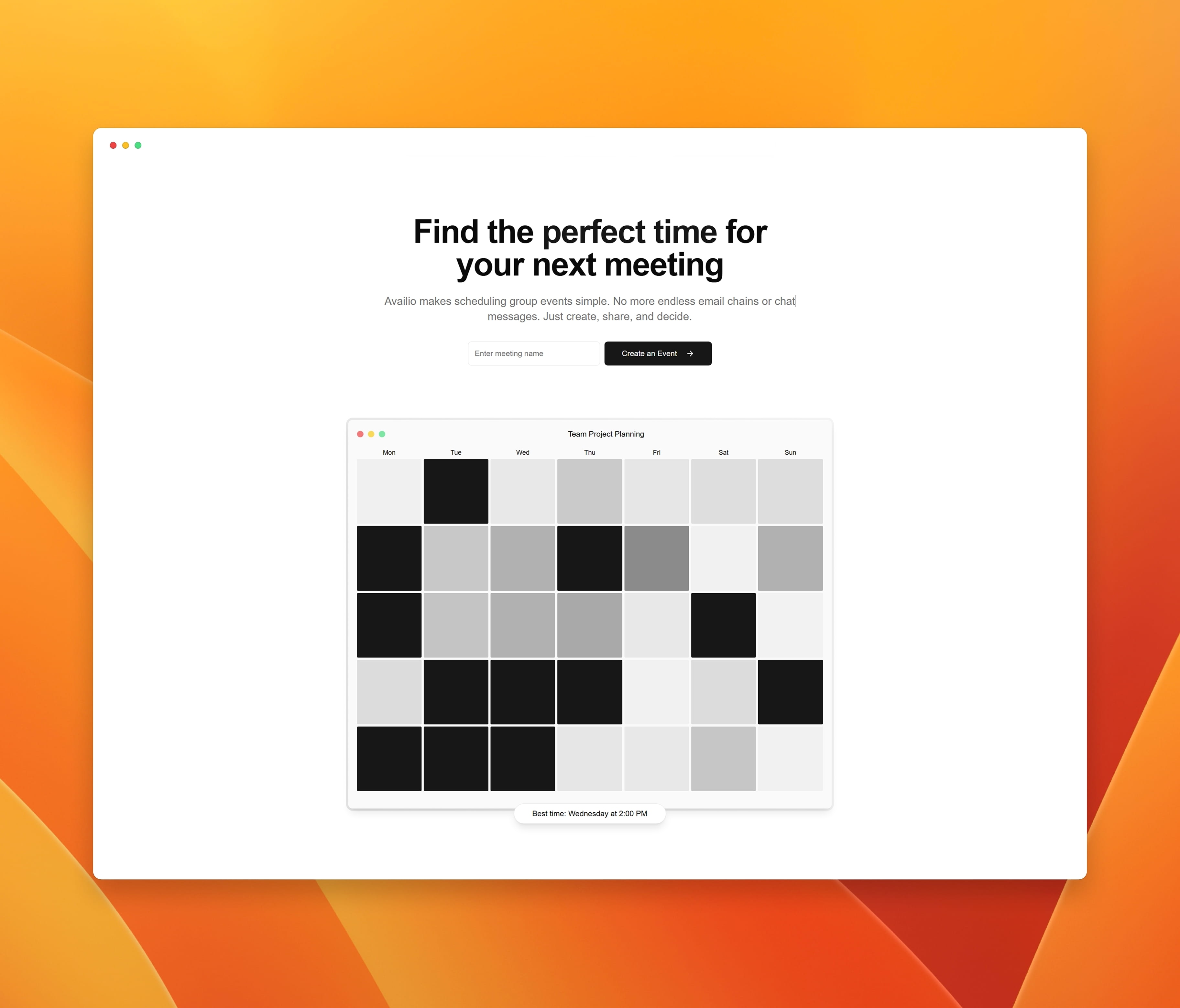 The goal was clear—build a lightweight, modern alternative to traditional scheduling tools. One that made it effortless to coordinate availability without accounts, logins, or outdated UI.